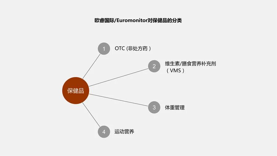 根据咨询公司欧睿国际/Euromonitor的分类,保健品可以分为 OTC (非处方药)、维生素/膳食营养补充剂(VMS)、体重管理、运动营养四大类。