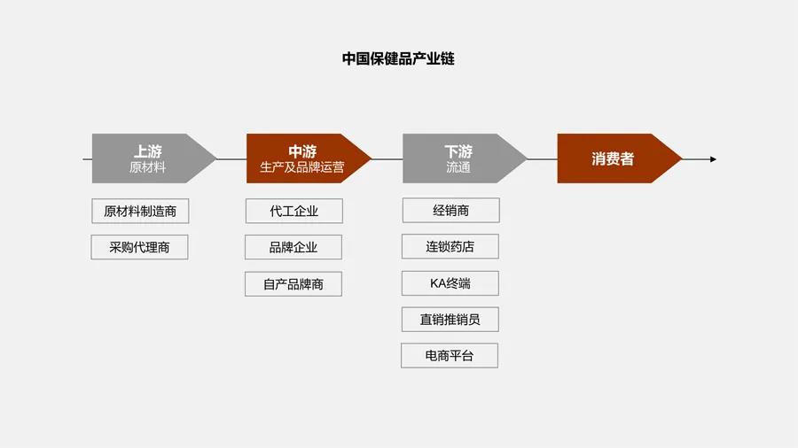 保健品行业的产业链,可以分为上游的原材料生产商,中游的品牌生产商和运营商,以及下游的渠道商。一般而言,在产业链中下游的渠道商,掌控着最大的话语权。但伴随着电商的强势崛起和监管的不断加强,传统的保健品分销渠道,例如直销、药店和商超被不断削弱,品牌在产业链中的地位也随着这一变化逐渐得到了提升。