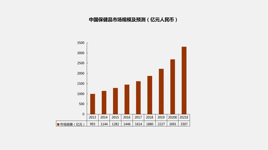 艾媒数据中心的数据显示,2019年中国保健品市场的市场规模达到2227亿元,预计在2021年市场规模将会达到3307亿元。TMOGroup预测,2019到2023年中国保健品市场的复合增长率将高达14%。